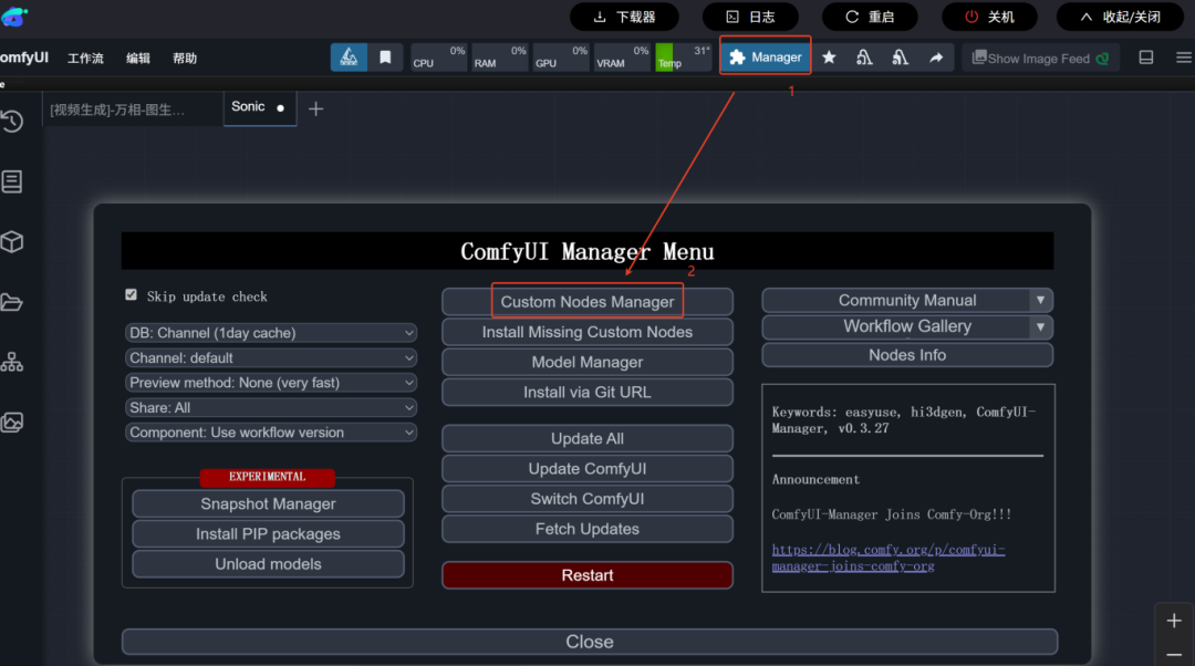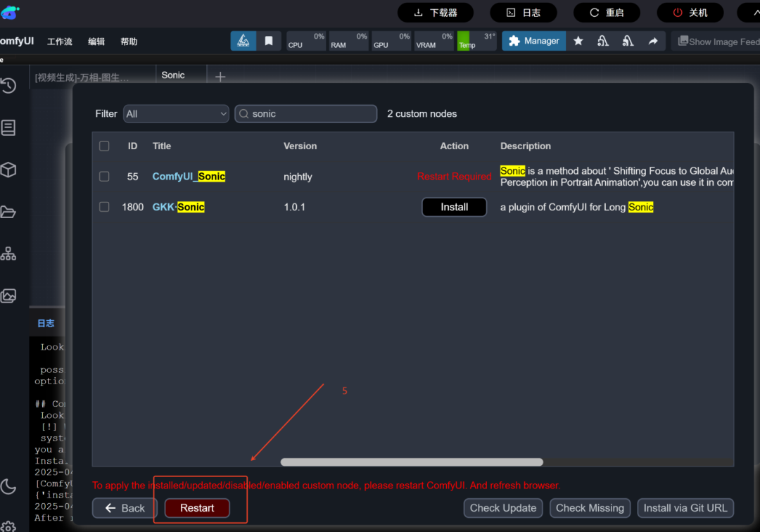 在ComfyUI管理器 → 节点管理 → 搜索Sonic → 下载相关节点 → 下载完成后点击【重启】实例。如下图所示