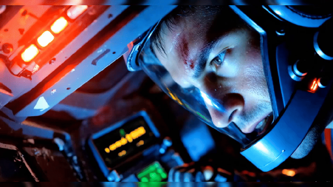 提示词:午夜,硝烟缝隙中漏下的碎光斜切过布满划痕的驾驶舱,高饱和度,人物特写构图。机甲驾驶员的半边脸紧贴着发烫的显示屏,额角渗着的汗珠在警报灯的红蓝闪烁中泛着油光,他紧咬的牙关,左侧眉骨的血痂混着油污凝固成暗红。