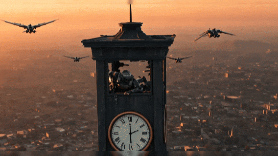 提示词:远景俯拍(黄昏,橙红色的阳光将破碎的都市轮廓拉得狭长,低饱和度,全景构图。断壁残垣间有座钟楼,露出发黑的木架。一群金属质感的机械鸟扑棱着带齿轮的翅膀,在夕阳里穿梭)。中景推进(一个穿着磨损防护服的身影正趴在窗台,右手握着的电磁步枪枪管垂在墙外)。近景特写(镜头切至人物手部,低角度仰拍,他戴着半截战术手套的左手正抠住窗台边缘)。