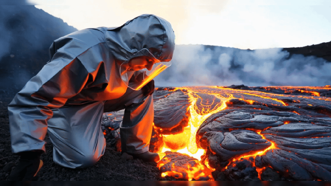 提示词:火山岩裂缝中涌出的岩浆,橙红与暗紫交织的流体表面腾起热浪。边缘光从岩浆内部迸发,在岩石表面切割出锯齿状亮斑,冷色调与高温形成视觉悖论。穿银灰色防火服的女地质学家单膝跪地,右手握着震颤的地质锤准备工作。