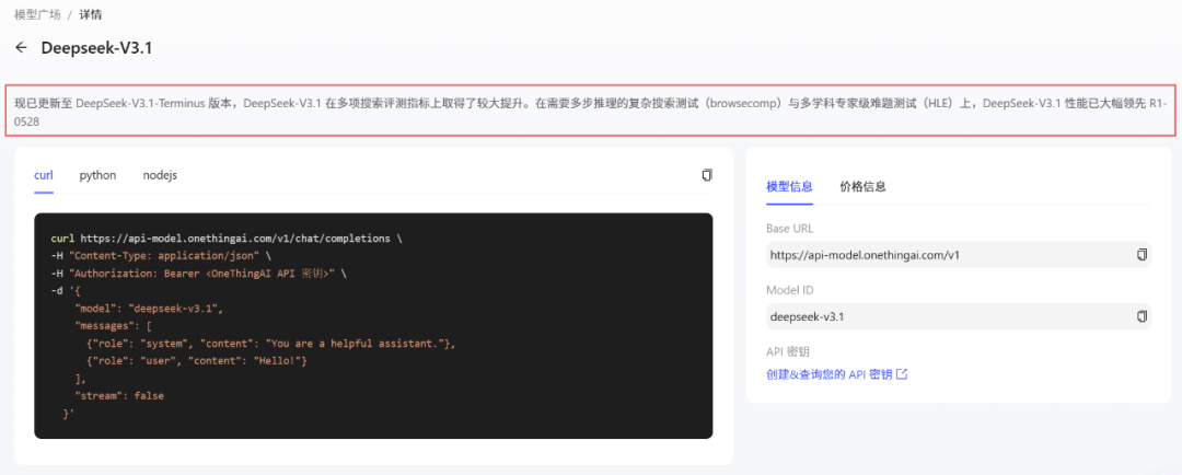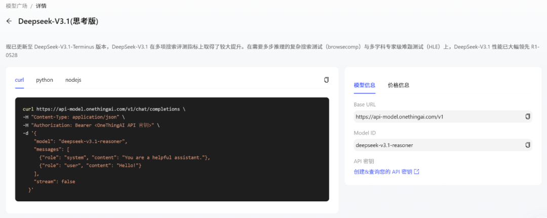 步骤三:OneThingAI平台给予curl、Python、Node.js三种技术方案,以便快速接入模型DeepSeek-V3.1-Terminus,满足多样化开发场景及开发者使用习惯。